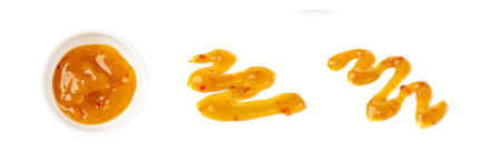 Mango Chutney Isolated, Sweet Orange Chili Paste Smear, Mango Chilli Sauce Blot, Drops on White Background
