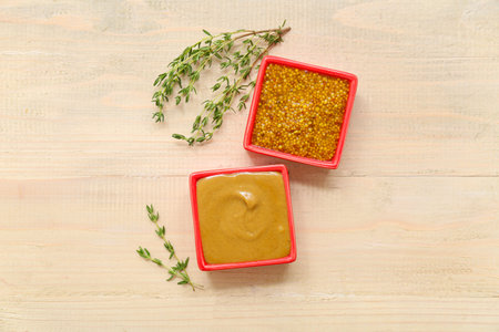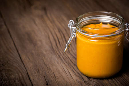 Natural mustard, seasoning and sauce on a wooden table