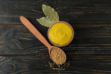 Bowl with mustard and spoon with seeds on wooden background