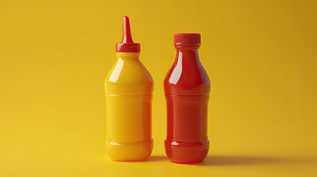 Bright and colorful mustard and ketchup bottles on a vivid yellow background, perfect for food-related designs, advertising, or culinary themes.