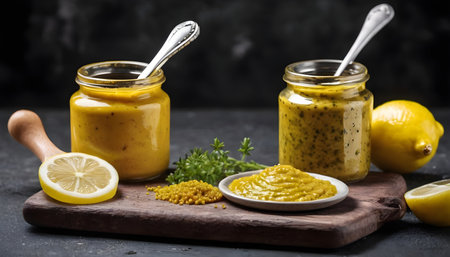 Assortment of different types of mustard with lemon on a cutting Board