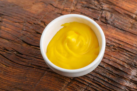 Mustard in small bowl on wooden backround