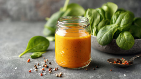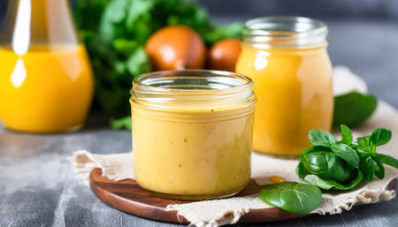 Two jars filled with bright yellow and orange puree create a striking visual contrast. Perfect for enhancing recipes, food photography, or showcasing vibrant culinary creations.