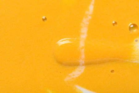 Yellow sauce splashes as a background. Top view.