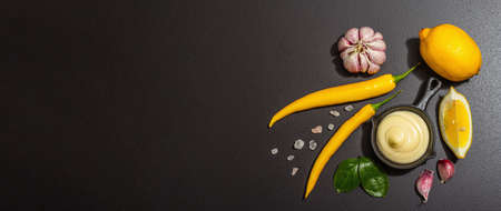 Cooking ingredients background. Spices, vegetables, garlic, yellow peppers chili. Black background, preparation food concept, flat lay, banner format