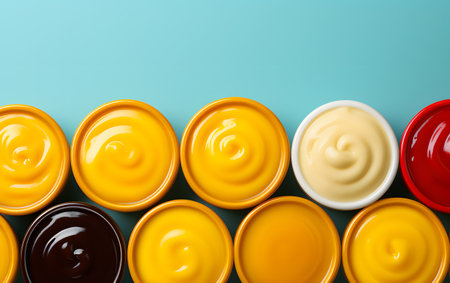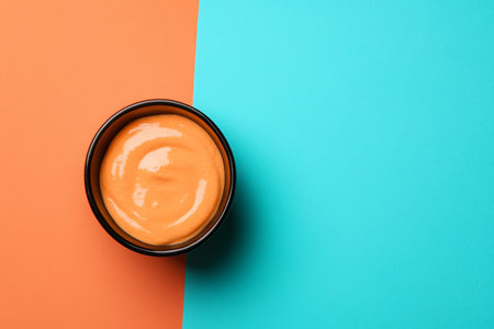 Bowl of ketchup and cheese sauce on colored background, top view with copy space.