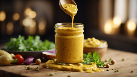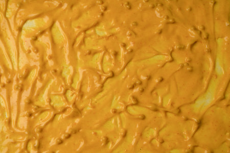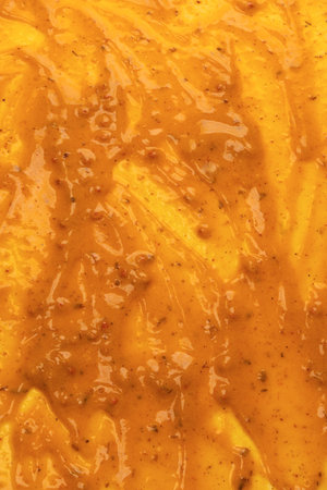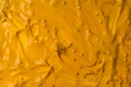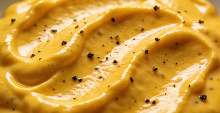 Vibrant close-up texture of spicy mustard swirls with pepper specks for culinary design