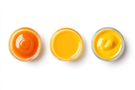 Three glass jars filled with different smooth sauces in orange, yellow-orange, and yellow hues, inviting creative use in various culinary dishes and snacks.