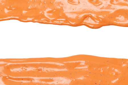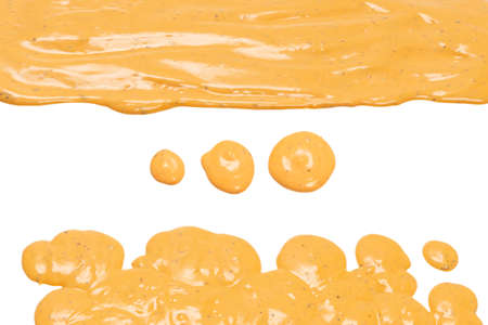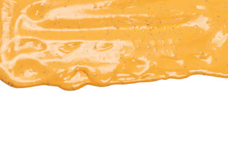 Smear of mustard sauce on white background, creativity in cooking, macro texture.