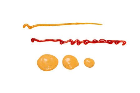 Mayonnaise mustard and tomato ketchup drops isolated on white background top view