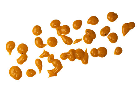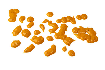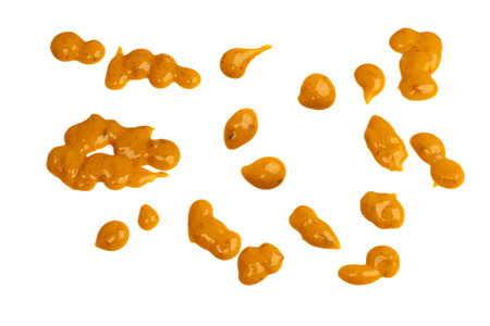 Splashes of mustard isolated on white background, top view