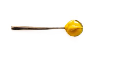 Spoon with mustard honey sauce isolated on white background