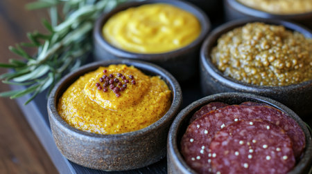 A vibrant assortment of mustards served in rustic stone bowls, showcasing the rich textures and colors. Perfect for enhancing meals and snacks.