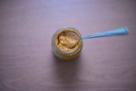 Fresh mustard in a jar with a spoon. On the stone table.