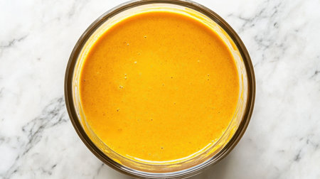 A close-up of a creamy golden sauce in a glass bowl, showcasing its rich texture and vibrant color, perfect for culinary inspiration and creative recipe ideas.