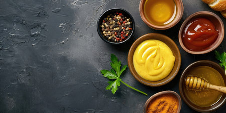 A delightful assortment of sauces displayed in small bowls on a dark slate backdrop, perfect for culinary inspiration and exciting meal preparation.