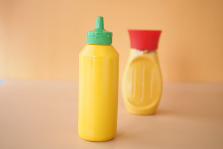 On a table, two vibrant bottles of mustard are displayed, set against a colorful background