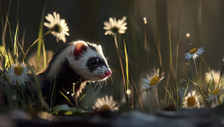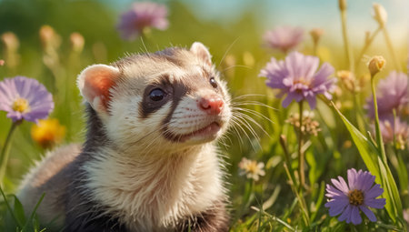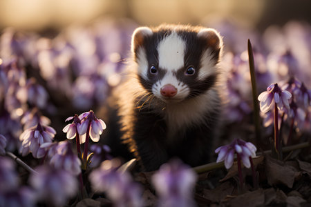 A ferret, primarily black and white, is positioned amidst a meadow of wildflowers and grass. The image displays a shallow depth of field, with soft focus on the foreground flora. Warm sunlight streams through, creating highlights and shadows. This scene can be suitable for use in wildlife or environmental projects.