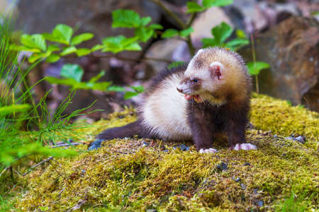 Ferret posing on moss deep in summer forest