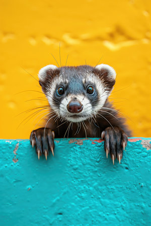 Curious ferret peeking over a bright teal and yellow backdrop, playful vibe