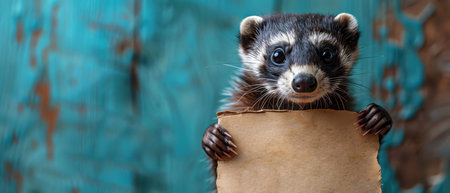 Ferret holding a blank sign, bright teal background, sharp focus, invitation to engage