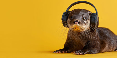 Cute otter wearing headphones on an orange background close-up. Copyspace, place for text. High quality photo