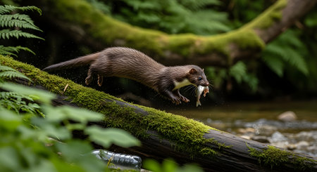 A European otter, Lutra lutra, is captured mid-stride on a moss-covered fallen tree trunk, holding a freshly caught fish in its jaws. The background shows a lush, green forest environment with a stream.