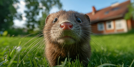 Curious Mink Hiding in Lush Green Grass, Close-up Portrait of Wildlife in Natural Habitat