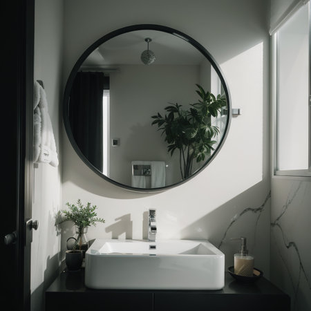 Modern black bathroom interior with decorative tree sink round mirror sunlight and copy space ing