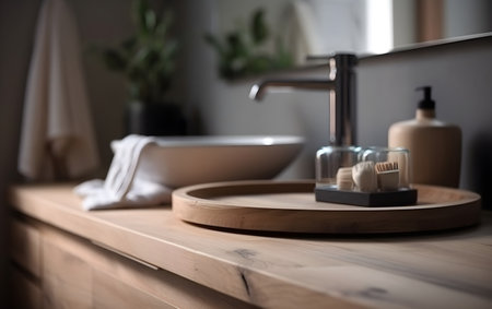 Bathroom interior with wooden countertop, washbasin, soap dispenser, towel and sink. Generative AI