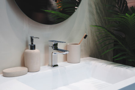 decor in stylish bathroom, glass with bamboo toothbrush, dispenser bottle and blossom flower on wooden tray near ceramic washbasin with black mixer and mirror on wall