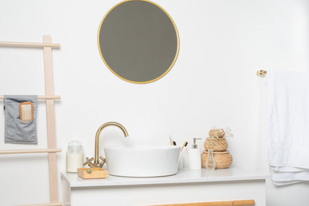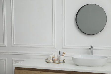Stylish mirror, vessel sink and cosmetic products in bathroom, space for text. Interior design