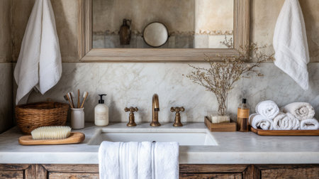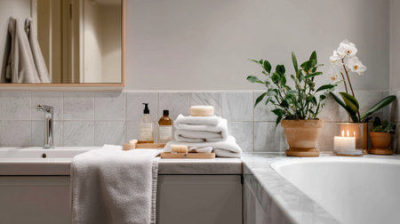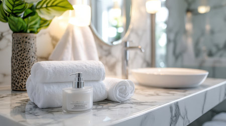 A serene bathroom countertop featuring soft towels, elegant skincare products, and a minimalist design that promotes relaxation and cleanliness.