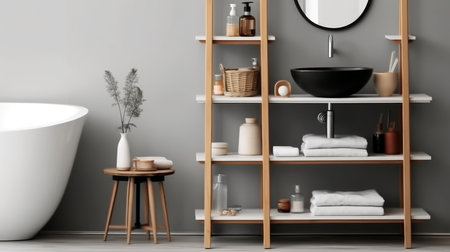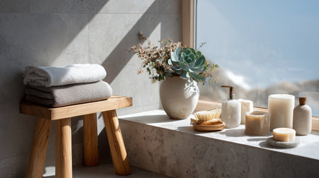Bathroom domestic spa procedure body care tools arrangement minimal ecology space organization