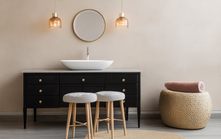 A sleek bathroom features a black dresser with drawers a round mirror above a minimalist sink and warm pendant lights. Cozy textiles and natural materials enhance the inviting atmosphere.