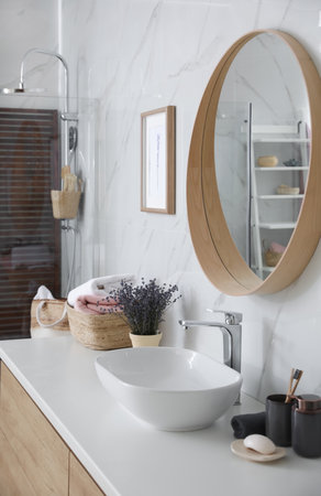 Mirror and counter with vessel sink in bathroom interior. Idea for design