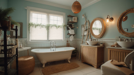 Interior design of Bathroom in Coastal style with Clawfoot tub decorated with Subway tile, Wicker material. Traditional architecture. Generative AI AIG24.