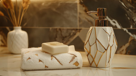 Discover a sophisticated bathroom scene featuring an elegant soap dispenser, soft towel, and bar of soap, elegantly arranged on a marble surface for a serene atmosphere.