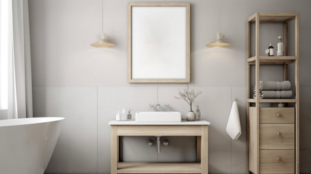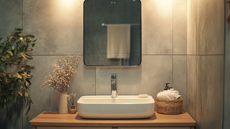 Elegant Bathroom Interior Showcasing a Modern Wash Basin with Stylish Fixtures and Decor Elements