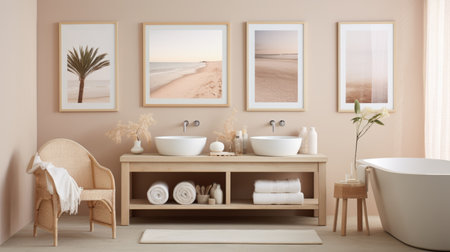a bathroom featuring two large picture frames and a palm tree near a light wooden vanity. the style of the room is characterized by light pink and dark beige tones, with realistic seascapes adorning the frames. the warm tonal range of light orange and dark beige creates a zen-inspired atmosphere. this uhd image showcases the soothing combination of pink and beige in this bathroom. ai