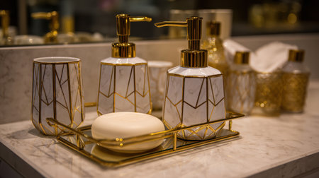 A beautifully arranged set of elegant bathroom accessories featuring marble patterns and gold accents, ideal for enhancing any modern vanity or countertop decor.