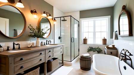 Farmhouse Elegance: Create an elegant farmhouse bathroom with a double sink vanity in distressed wood, a walk-in shower with glass doors, and classic white subway tiles. Incorporate rustic light fixtures, woven baskets for storage.
