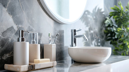 This image showcases a modern bathroom setting featuring stylish accessories, soft towels, and a serene atmosphere, perfect for relaxation and elegance.