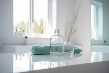 An AI-generated illustration of clear glass bottles and a towel on a countertop in a bathroom.