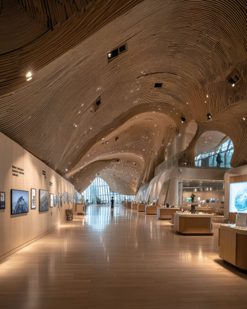 An interior space displays a contemporary design with a curved ceiling and integrated lighting. Natural light illuminates the wooden flooring and the soft-toned walls. The architectural style suggests a modern art gallery or a museum, suitable for commercial or editorial applications.