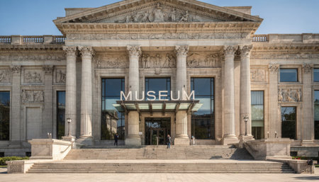 Medium shot of a museum facade featuring detailed architectural elements with the main entrance sign in sharp focus under bright daylight.