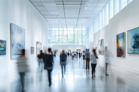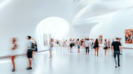 Abstract image of a blurred modern gallery space with visitors admiring art in minimalistic design