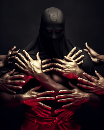 Halloween concept. Black mannequin in red costume with hands around his body.