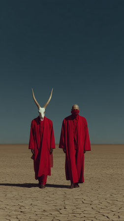 Two demons in the desert in red cloaks and with large horns, the concept of evil, two friends and two Satans, red demon. High quality
