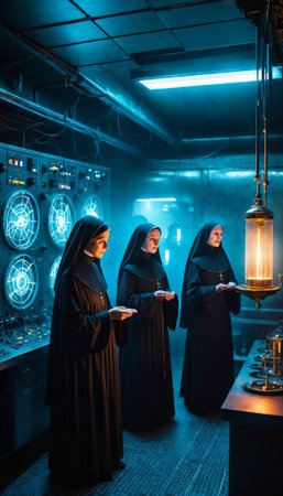 scifi fiction The three women nun wearing black robes, standing in a dimly lit room., generative AI